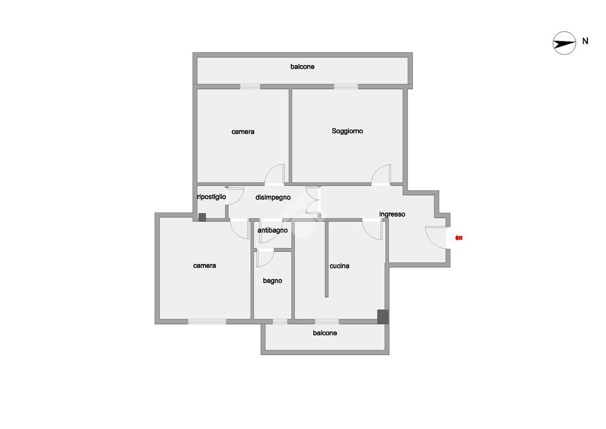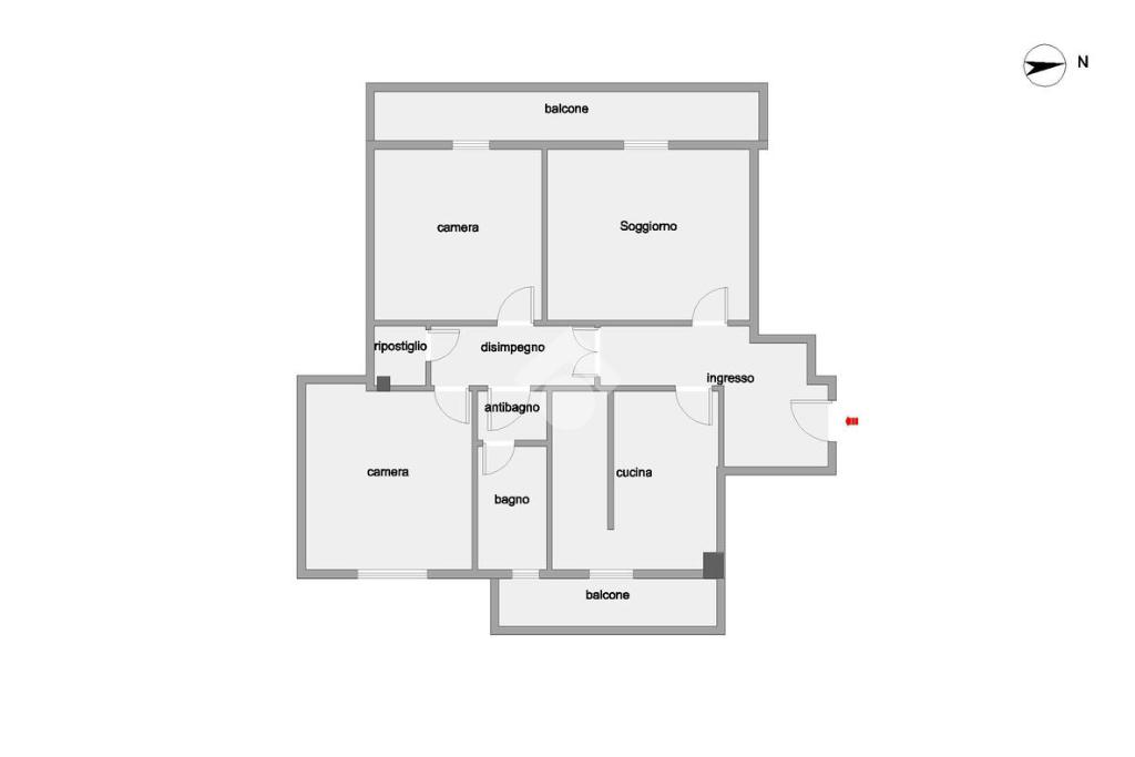 L'appartamento è composto da cucina abitabile con accesso al primo balcone, soggiorno con accesso al secondo balcone, due camere da letto matrimoniali, bagno finestrato con vasca e ripostiglio.
